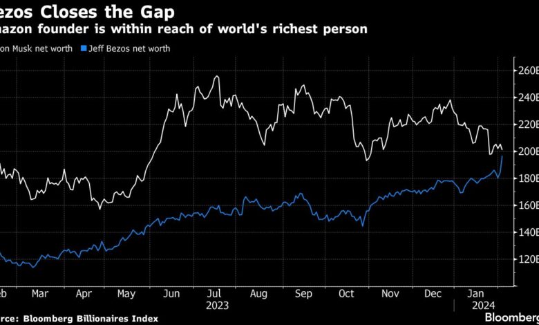 The disclosure comes after Amazon reported its best online sales growth since early in the pandemic, sending its shares rallying by nearly 8% to $172. Bezos’ wealth jumped a commensurate amount, gaining $12.1 billion Friday to put him $8.1 billion behind first-place Elon Musk, according to the Bloomberg Billionaires Index. Bezos hasn’t been No. 1 on the index since 2021.